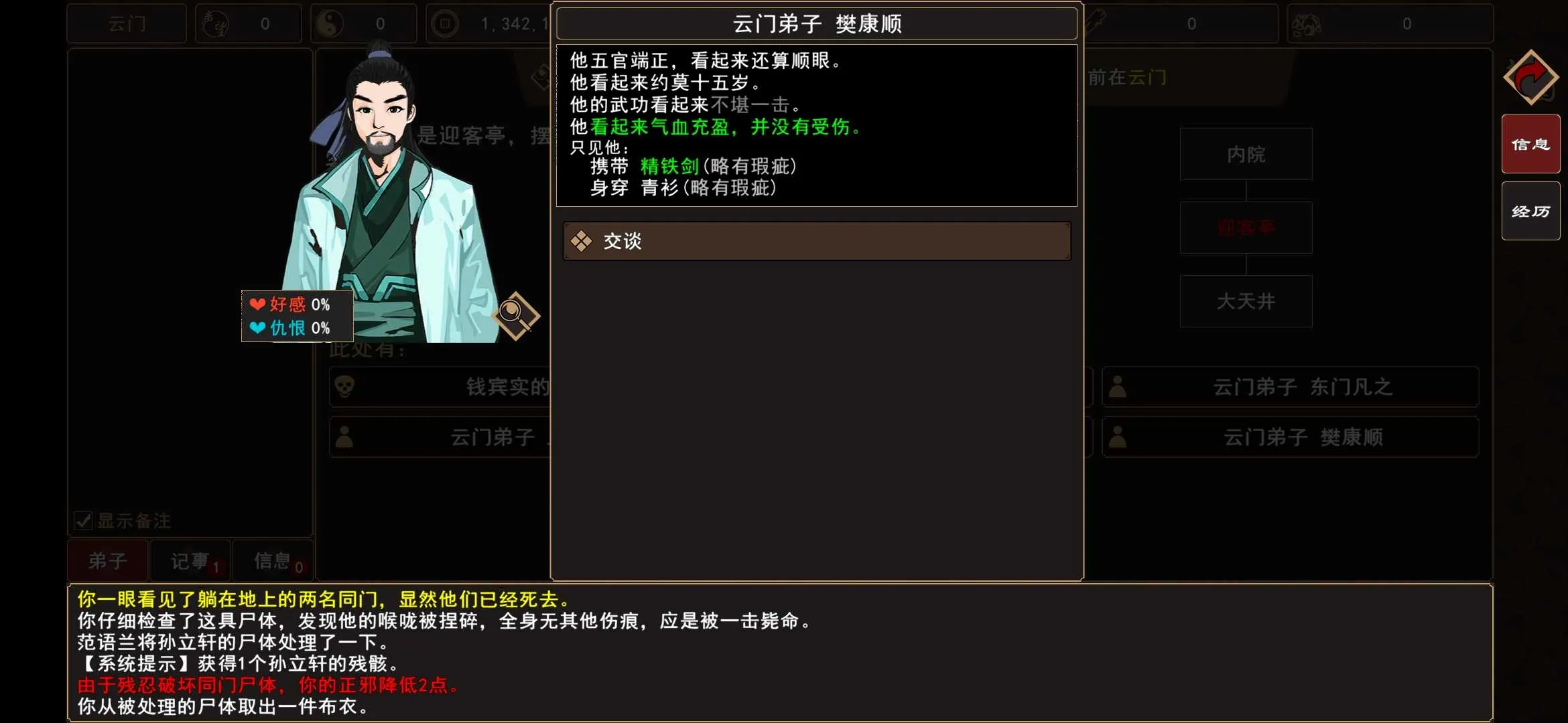 2、感受高自由度。游戏以MUD类游戏为基础构建开放江湖,可摆脱主线限制,带领弟子自由探索,江湖实时变化,大量随机任务带来多样体验。