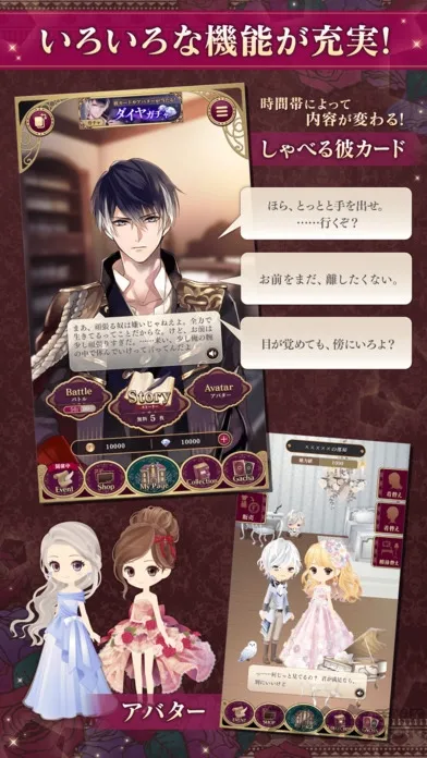 1、浪漫剧情:游戏设置了跌宕起伏又唯美浪漫的故事,大量分支选项让玩家的选择影响剧情走向,还有男性视角书信等辅助剧情,可从多角度深入了解故事。