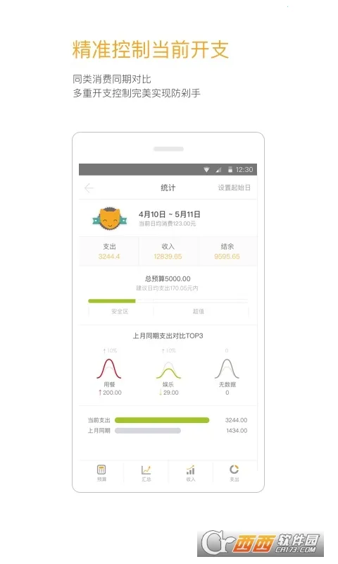 2、其具备强大的统计分析功能,通过分类饼图、柱状图以及收支折线图等,完美统计金钱流向,每笔消费都有据可查。