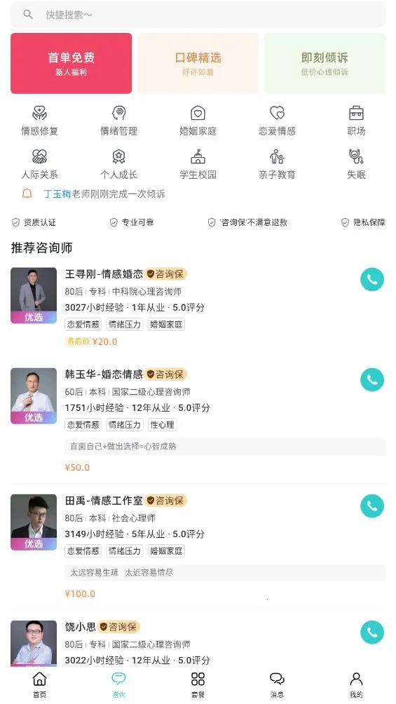 2、多元咨询服务:覆盖情感咨询、家庭婚姻指导等多方面,满足用户不同的心理需求,助力情感修复与家庭和谐。