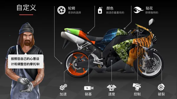 1、《王牌飙车》游戏中有着丰富的摩托选择,能解锁数十种不同类型,模拟了16种逼真的摩托车模型,可随意提升性能、改变设计。