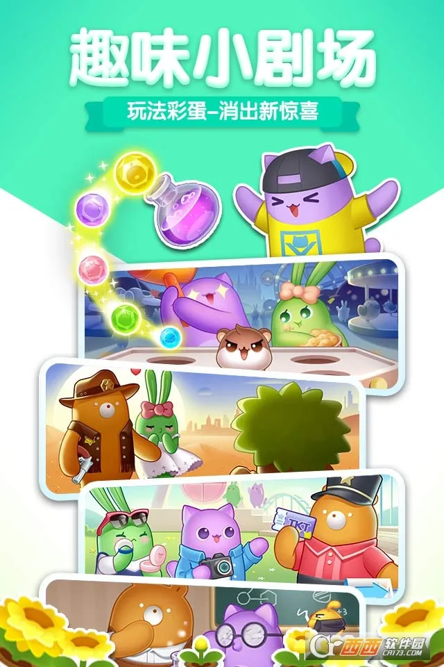 2、内容丰富:有数百个多变关卡、花样特殊棋子、主题剧场玩法、3D旋转地图,还有实验室打地鼠、街头霸王等多样场景,不同场景通关要求不同,能保持游戏新鲜感。