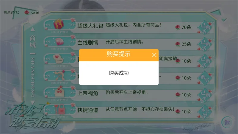 3、然后我们可以打开商城功能,本游戏已经成功解锁无限鲜花功能,你可以随意购买商城里的物品。